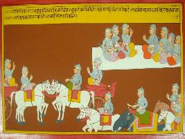 | Description / विवरण | Miniature painting based on Mahabharat - Shalya parva. The painting depicts that Duryodhana in grat tension than he decided to make Shalya the commander of their army and he meet Aswasthama on the way and talking about the appointment of Shalya on their new commander-in-chief. |