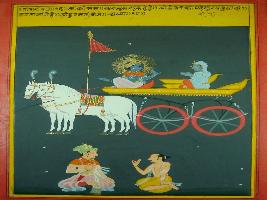 | Description / विवरण | Miniature painting based on Shri Bhagwat Gita. It depicts Krishna preaching Arjun that those who think about themselves are fools. They work according to their own wishes and would only do wrong deed. |