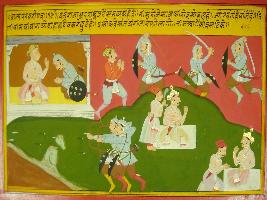 | Description / विवरण | Miniature painting based on Mahabharat - Shalya parva. On the painting Sanjay asking Dhritrashtra that Bhim is a very strong man who can destroy a hill very easily. On the painting depicts the above mentioned story. |
