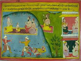 | Description / विवरण | Miniature painting based on Mahabharat - Udyam parva. Kritvarna is depicted telling Amba that if she wants to mesmerize Bhishma, he has to defeat Shalya and she has to go to Parasurama. |
