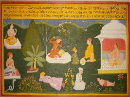 | Description / विवरण | Miniature painting based on Sanskrit drama - Prabodh Chandrodaya depicting two yogis in the right part and a king in left part of the painting. In upper central part, a king is wearing turban and a person is taking food with his child. In the lower central part, two persons are sleeping and one old man is sitting. |