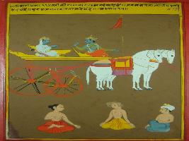 | Description / विवरण | Miniature painting based on Shri Bhagwat Gita. It depicts Krishna preaching Arjun that yogis are always seen performing hard work while fools can never be seen doing hard work. |