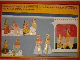 | Description / विवरण | Miniature painting based on Sanskrit drama - Prabodh Chandrodaya. On the upper side two couples are depicted sitting and talking, on the lower side also two couples depicted sitting, one at a palace and two men are depicted talking in the bottom part. |
