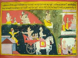 | Description / विवरण | Miniature painting based on Mahabharat - Udyam parva depicting Akritvrana is talking to a sage and asking him about Parasurama, then the sage says that Parasurama will reach there in the next morning. After that he introduces his daughter Amba who was abandoned by both Bhishma and Shalya. |
