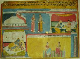 | Description / विवरण | Miniature painting based on Rasikpriya depicting Krishna-Radha Sanyog. The painting depicts Sanyog Rasa, the union of Radha and Krishna. |
