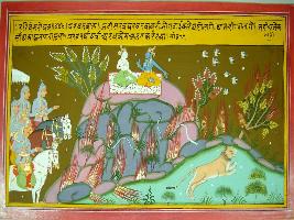 | Description / विवरण | Miniature painting based on Harivansha depicting the army of Jarasandha, at the right side, who put a fire on the mountain where Krishna and Balram are sitting. Lion, birds and snakes are depicted trying to escape from the fire. |