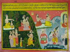 | Description / विवरण | Miniature painting based on Mahabharat depicting Vitihotra sage asking Karna not to go anywhere and Parashurama will help you to get rid of your sorrow. It also depicts celestial dancers and Gandharvas dancing and Parasurama coming to palace and sages worshipping him. |