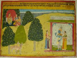 | Description / विवरण | Miniature painting based on Rasikpriya depicting Nayika sitting with two gopis on upper right corner. Nayak and Nayika are seen in the palatial balcony and a gopi standing outside. Two deers are standing in the forest. |