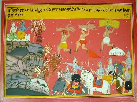 | Description / विवरण | Miniature painting based on Harivansha depicting Shishupal telling Jarasandha, in the lower part, to burn the mountain, where Krishna and Balram are sitting. On the left upper part people are depicted bringing woods to burn the mountain. |