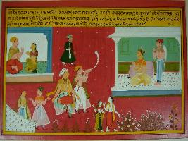 | Description / विवरण | Miniature painting based on Sanskrit drama - Prabodh Chandrodaya depicting Kama talking to a queen. At the middle two men are playing instruments. At the lower right two men are talking to each other. At the extreme left, Vivek is depicted sitting inside a palace. |