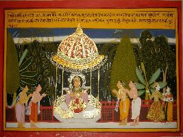 | Description / विवरण | Miniature painting based on Sanskrit drama - Prabodh Chandrodaya depicting Kama telling Rati, on the left side, about Maya, who is responsible for the birth of the Trilok. In the centre Maya has been depicted with four worshippers around her. |