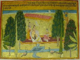 | Description / विवरण | Miniature painting based on Rasikpriya depicting Krishna appearing before Radha to please her. At the centre of painting, Radha is shown sitting with her friends in a garden. Krishna is making appearance and shown standing behind tree. |