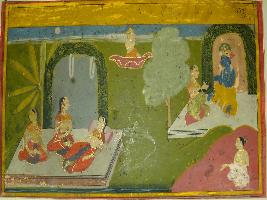 | Description / विवरण | Miniature painting based on Rasikpriya, depicting Radha sitting on the couch and near by friends are standing at upper left part. To its right, Shri Krishna is shown standing looking towards her. At the upper middle part, three demigods are shown flying on yaan. |