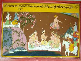 | Description / विवरण | Miniature painting based on Harivansha depicting at the centre Jarasandha discussing with other kings to go to the mountain to search for Krishna. A man is seen on the upper left side conveying this message to the army. Krishna and Balram are depicted sitting on the mountain at the right side. |