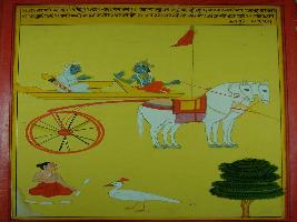 | Description / विवरण | Miniature painting based on Shri Bhagwat Gita. It depicts Krishna preaching Arjun about Vedas and resources enshrined in the essence of Vedas. |
