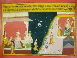 | Description / विवरण | Miniature painting based on Mahabharat - Udyam parva. The painting depicts the stay of Amba, Ambalika and Ambika. Where after getting insult from Bhishma Ambalika and Ambikais coming to Shalya when also they get insultation. One painting describe above mentioned stay. |
