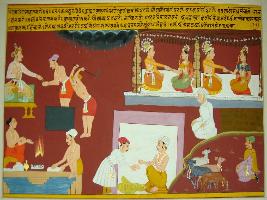 | Description / विवरण | Miniature painting based on Eklinga Mahatmya depicting about Kalyug. The painting depicts four different Varnas viz, Brahman, Kshatriya, Vaishya and Shudra performing the dharma assigned to them. The painting depicts on the upper right side king giving daan. Below it a Brahman is depicted doing yagna. Next to it a Vaishya is depicted, doing cultivation, marketing and looking after animals. A shudra is depicted helping the Brahman and the king, on the upper left side a marriage is depicted. On the top part cloudy sky is seen with rainfall. |