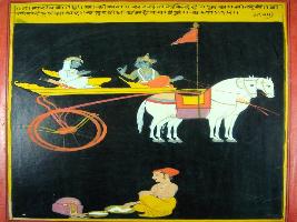 | Description / विवरण | Miniature painting based on Shri Bhagwat Gita. It depicts Krishna preaching Arjun that he is the Agni residing in body of human being and he is responsible for digestion of all food and generation of energy within the body of human being. |
