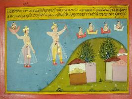 | Description / विवरण | Miniature painting based on Mahabharat - Udyam parva depicting Krishna asking Duryuddhana that if he is a man then he should fight with Arjun. He again says that all the gods in heaven are afraid of him and if he do friendship with him then he will be in profit. |