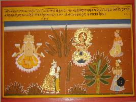 | Description / विवरण | Miniature painting based on Sanskrit drama - Prabodh Chandrodaya depicting Lord Brahma and Saraswati sitting on lotus flowers, in the upper part. In the lower part, union of Chandrama and Tara is depicted. |