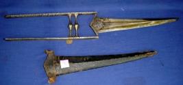 | Description / विवरण | Katar Dagger made of faulad type of iron with grooves on the slightly curved blade and M shape handle. End of the blade has embossed figure of deities on both sides and the handle has two bhoglis. It has partly damaged black leather scabbard. |
