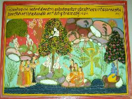 | Description / विवरण | Miniature painting based on Harivansha depicting Krishna having four with Gopis in palatial Garden. It is incomplete painting. |