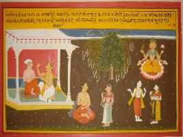 | Description / विवरण | Miniature painting based on Sanskrit drama - Prabodh Chandrodaya depicting Saraswati in the upper left part. Rati is talking to Kamdev about Saraswati. In the right part, a king and a noble are sitting in a palace and a seated man is talking to a female. |
