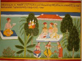 | Description / विवरण | Miniature painting based on Sanskrit drama - Prabodh Chandrodaya depicting Kama telling Rati about his importance in the worldly life as the base of it. Kama and Rati are seen seated on a tree. Three men are seated and three musicians and dancers are performing before them. |