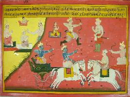 | Description / विवरण | Miniature painting based on Mahabharat - Udyam parva depicting Bhishma is telling Bhishma that he would fight with Arjun and Krishna but would not fight with Shikhandi. Shikhandi had given up throne for his younger brother. He is actually women in his privious birth. |