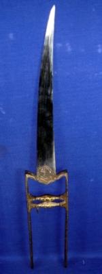 | Description / विवरण | Iron Katar Dagger having slightly curved blade and M shape handle. The handle has embossed elephant head at the blade end , two bhoglis and koft work of vine and blossom motif which is partly rubbed out. |