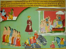 | Description / विवरण | Miniature painting based on Eklinga Mahatmya depicting at the upper right corner Vayu with green body telling Narad holding a Veena about Yudhisthir. At the upper left part, Yudhisthir and Krishna are depicted sitting on a throne, in front of whom four Pandavas are sitting. Elephants and horses, with their rides are depicted at the lower left side. At the lower right side Pandavas with Draupadi going for Swargayatra is depicted. |