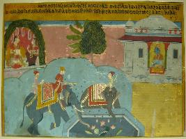 | Description / विवरण | Miniature painting based on Rasikpriya depicting the story of Hasti Lashanam. On one part of the painting Radha is depicted sitting and talking to a friend, on the other side Krishna is depicted sitting. In the middle two elephants are depicted drinking water from the pond. |