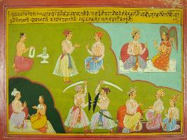 | Description / विवरण | Miniature painting based on Mahabharat - Udyam parva depicting dharma, wealth and Kama existed in all ages, and people get happiness in this earth and paraloka. It also depict anger prevent the way of happiness. It also depict 5 types of strength among which physical strength is the lowest. |