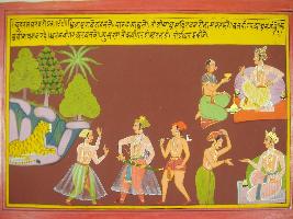 | Description / विवरण | Miniature painting based on Mahabharat - Udyam parva depicting Vidur telling Dhritrashtra that Pandavas are like tigers and Kauravas are like forest, one cannot be completed without others, in the way without dharma artha does not meant anything and without heaven, hell does not meant anything. |