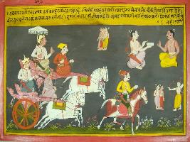 | Description / विवरण | Miniature painting based on Mahabharat - Udyam parva depicting Bhishma is telling Duryoddhana that Shikhandi is great Charioteer and Dhritdhyum is commander-in-chief, great Charioteer and would fightt bitterly. His army is telling that he had anger of Rudra. He is very brave and his army can be compared with Deva sena. |