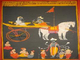 | Description / विवरण | Miniature painting based on Shri Bhagwat Gita. It depicts Krishna preaching Arjun that the world is like which has no origin and end, no weapons can destroy it. |