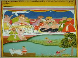 | Description / विवरण | Miniature painting based on Kalila Damana, where Damana says as seen in the painting that a king is talking with same courtiers while a farmer is seen in the lower part. It is an unfinished story having Mughal influence. |