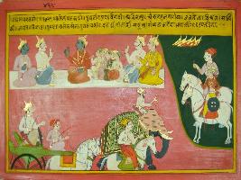 | Description / विवरण | Miniature painting based on Mahabharat - Udyam parva depicting Bhishma is telling Duryodhan about the warriors of Pandavas army. Virati who is Draupadi s son Abhimanyu who can be compared to Arjun, Vikranti, Satyaki, Yadava Virat a and Dhrupad are warriors in side of Pandavas. They got their army. They all can produce fire. |