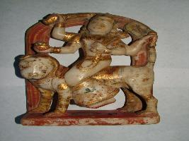 | Description / विवरण | It is a sculpture of four armed goddess. Shown sitted on lion. The four armed goddess is shown holding sword, rident, a pot and drum painted in golden colour. |