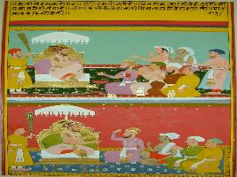 | Description / विवरण | Miniature painting based on Kalila Damana, where some courtiers are telling a story of Kalila Damana. In the painting the king is seen that sitting on the throne along with his subjects. |