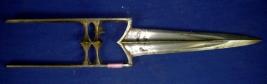 | Description / विवरण | Katar dagger having straight pointed blade with grooves. The handle is M shaped with two bhoglis. |