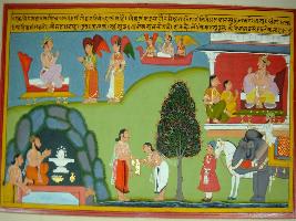 | Description / विवरण | Miniature painting based on Eklinga Mahatmya depicting Indra with two apsaras and a king in the left upper side. In the lower row a sage is worshipping Shiv linga. The painting says that the king should worship Ekalingji by pleasing his subjects and can achieve the fame like Indra. |