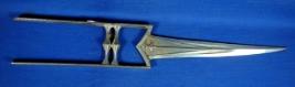 | Description / विवरण | Katar dagger having straight pointed blade with grooves. The handle is M shaped with two bhoglis. |