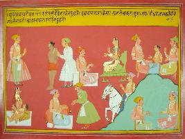 | Description / विवरण | Miniature painting based on Mahabharat - Udyam parva depicting that how the king Dayavan is ask his servants, children, minister and wife. |