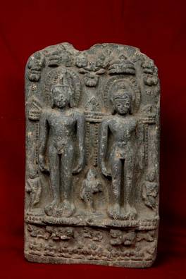 | Description / विवरण | Adinatha and Mahavira, the first and the twenty-fourth Tirthankaras. Both stand in kayotsarga posture with attendants by their sides. The pedestal seems to have the depictions of their respective emblems, a bull (Adinatha) and a lion (Mahavira). |