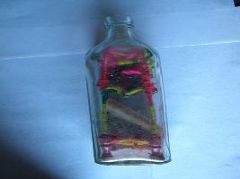 | Description / विवरण | It is a bed of wood and woollen thread is placed inside a bottle with red base and metal beads are embeded for jingling. |