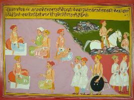 | Description / विवरण | Miniature painting based on Mahabharat - Udyam parva depicting that king does nothing and only servants work for him. On the same way father takes care of son. The servant work for king and cannot leave the service. |