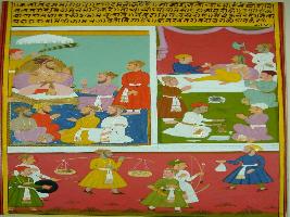 | Description / विवरण | Miniature painting based on Kalila Damana where Damana says a story that anything will be fine with a clever man but a stupid man can destroy a good tusk. Painting has Mughal impact. |