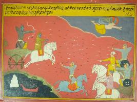 | Description / विवरण | Miniature painting based on Mahabharat - Drona parva depicting Garuda come to help Arjun in war and by seeing Garuda armies of Drona flee in the way a boat flee in fear of hitting a mountarin. |