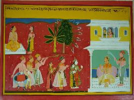 | Description / विवरण | Miniature painting based on Sanskrit drama - Prabodh Chandrodaya depicting a female standing in front of a seated Pundit at the upper right corner. Two couples are standing in front of a king and musicians are playing musical instruments. Two princess are watching from the palatial balcony. |